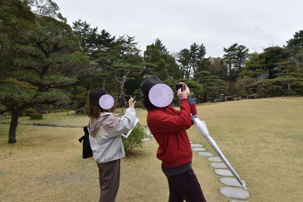 綺麗な六華苑の写真を撮るのに必死な2人…